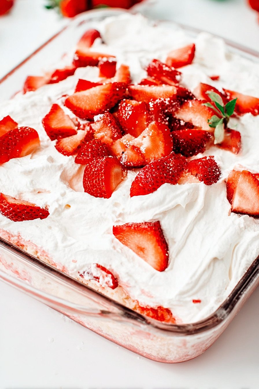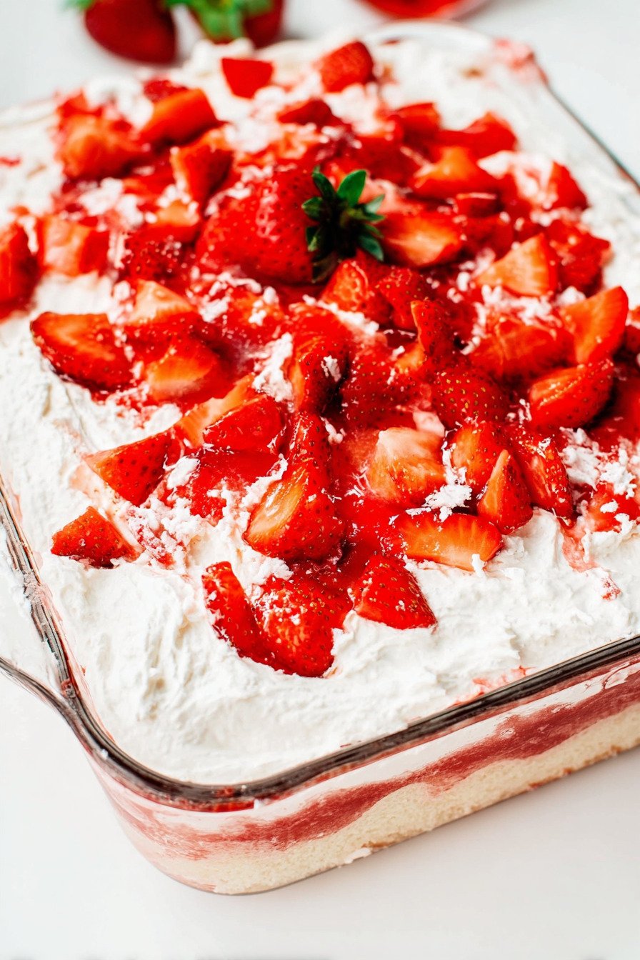 For an even prettier presentation, wait to add the fresh strawberries until close to serving time. This keeps them from releasing too much juice onto the topping. You can also swap whipped topping for stabilized homemade whipped cream if you want a more homemade finish while still keeping the easy strawberry cake recipe feel that makes this dessert so approachable.